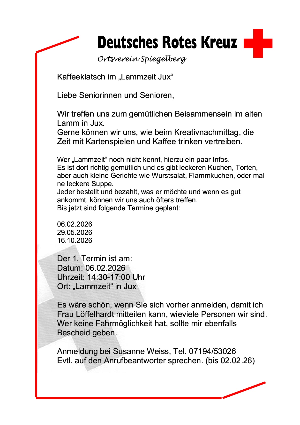 Die Termine für unsere Seniorenveranstaltungen bitte aus dem amtlichen Mitteilungsblättle entnehmen.